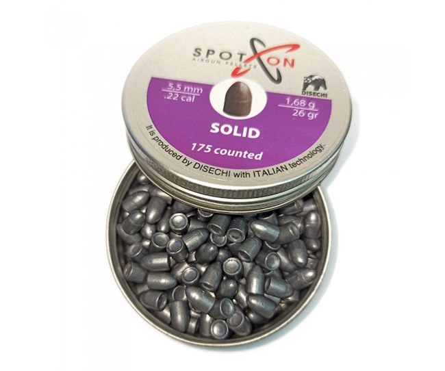Пули SPOTON Solid - высокоточные утяжелённые пули с полусферической головной частью калибра 5,5 мм для средних дистанций. В упаковке 175 штук средним весом 1,68 грамм.
